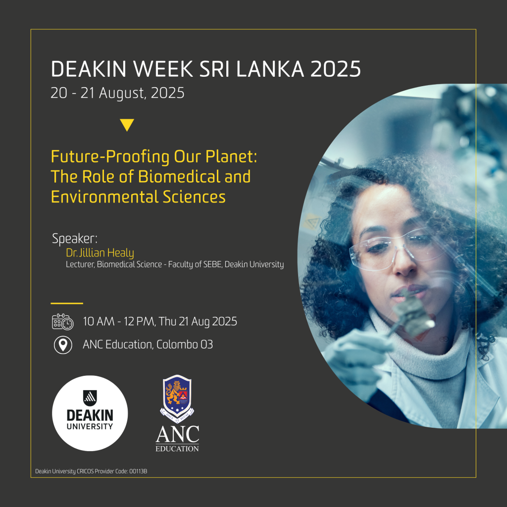 Join us for Deakin Week Sri Lanka 2025 at ANC Education, where Dr. Jillian Healy from Deakin University will lead an insightful session on “Future-Proofing Our Planet: The Role of Biomedical and Environmental Sciences.” This exclusive event, taking place on 21st August from 10 AM to 12 PM, is a must-attend for students passionate about sustainability, science, and global impact. Discover academic pathways and connect with a leading Australian university right here in Colombo.