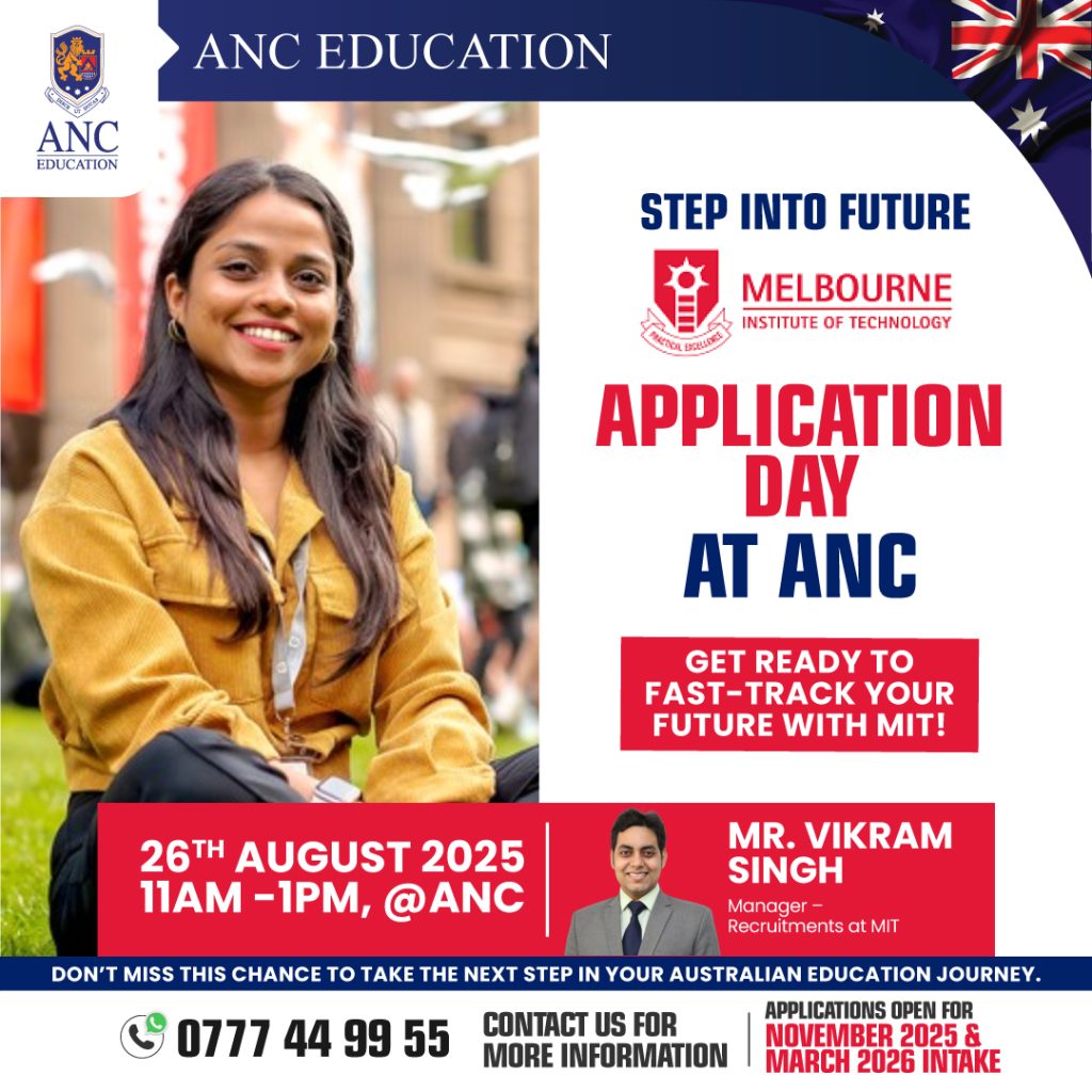 Step into your future with Melbourne Institute of Technology! Join us for Application Day on 26th August 2025 from 11 AM to 1 PM at ANC and meet Mr. Vikram Singh, Recruitment Manager at MIT. Get on-the-spot application guidance, explore study options in Melbourne and Sydney, and prepare for the November 2025 and March 2026 intakes.