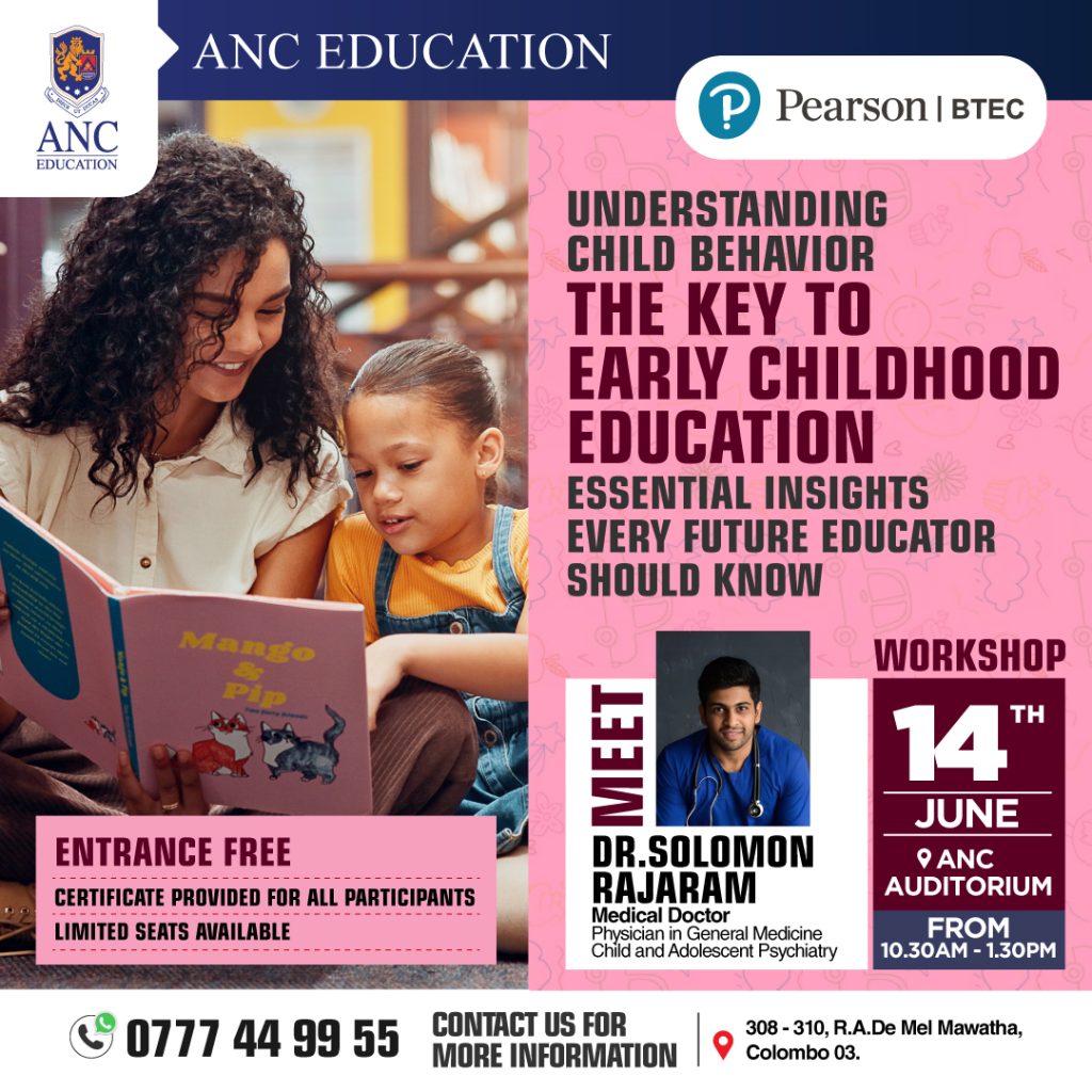 ANC Education is proud to host a transformative workshop for aspiring early childhood educators. Join Dr. Solomon Rajaram an expert in child and adolescent psychiatry, as he shares essential psychological insights into child behavior – a foundational element in shaping future-ready educators.