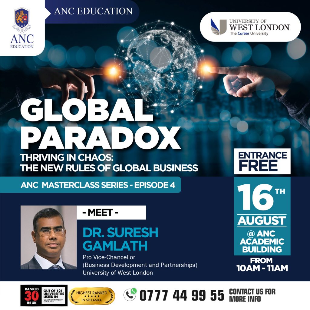 Join us for Episode 4 of the ANC Masterclass Series on “Global Paradox: Thriving in Chaos – The New Rules of Global Business”, led by Dr. Suresh Gamlath, Pro Vice-Chancellor of the University of West London. Taking place on 16th August from 10 AM to 11 AM at the ANC Academic Building, this free session is a must for business students and professionals eager to navigate today’s complex global economy with fresh perspectives and practical insights.